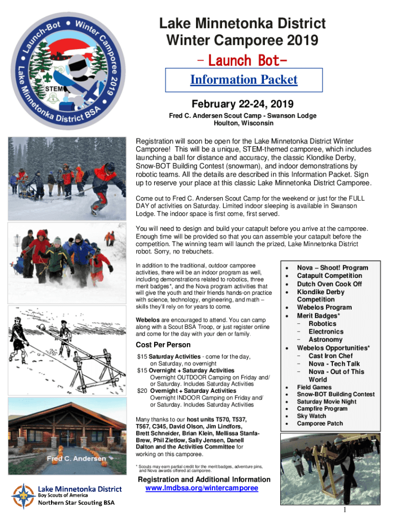 Lake Minnetonka District Winter Jamboree 2019 Launch Information Packet February 2224, 2019 Fred C. Andersen Scout Camp Swanson Lodge Houston, WisconsinRegistration will soon be open for the Lake