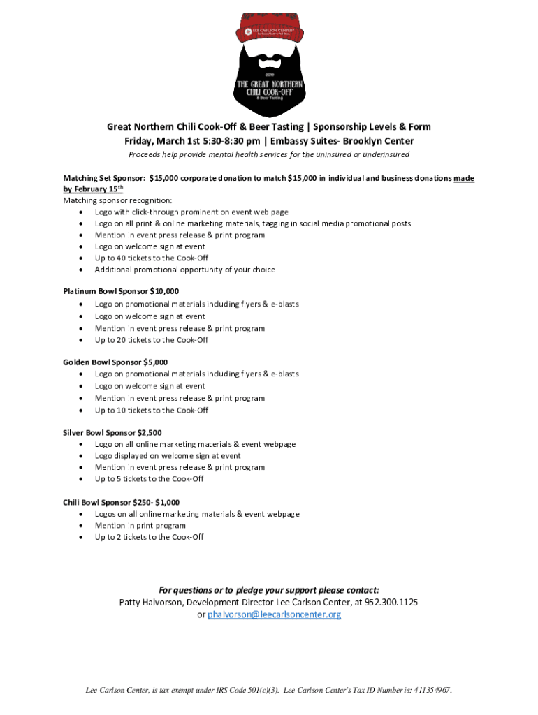 Great Northern Chili Cookout & Beer Tasting Sponsorship Levels & Form Friday, March 1st 5:308:30 pm Embassy Suites Brooklyn Center Proceeds help provide mental health services for the uninsured or