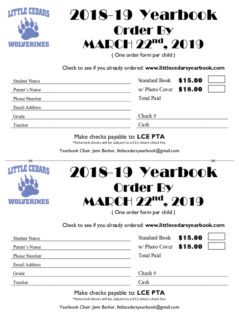 201819 YearbookOrder By ND MARCH 22, 2019 (One order form per child) Check to see if you already ordered: www.littlecedarsyearbook.comParents Name$15.00 w/ Photo Cover $18.00Phone NumberTotal PaidStandard