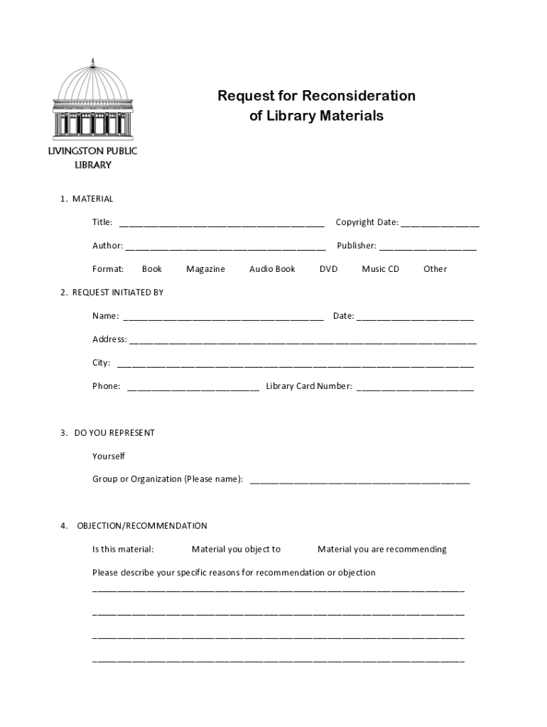 Request for Reconsideration of Library Materials1. Materialize: Copyright Date: Author: Publisher: Format:BookMagazineAudio BookDVDMusic CDOther2.REQUEST INITIATED Became: Date: Address: City: Phone:
