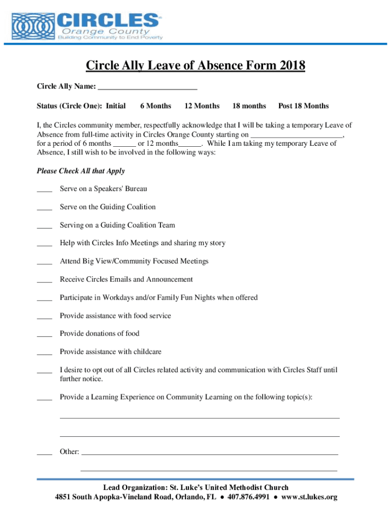 Circle Ally Leave of Absence Form 2018 Circle Ally Name: Status (Circle One): Initial6 Months12 Months18 months Post 18 Months, the Circles' community member, respectfully acknowledge that I will