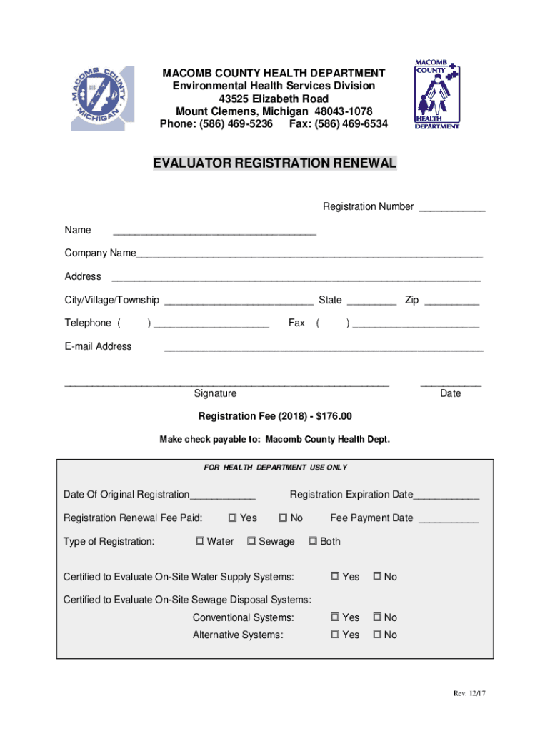 MACOMB COUNTY HEALTH DEPARTMENT Environmental Health Services Division 43525 Elizabeth Road Mount Clemens, Michigan 480431078 Phone: (586) 4695236 Fax: (586) 4696534EVALUATOR REGISTRATION RENEWAL