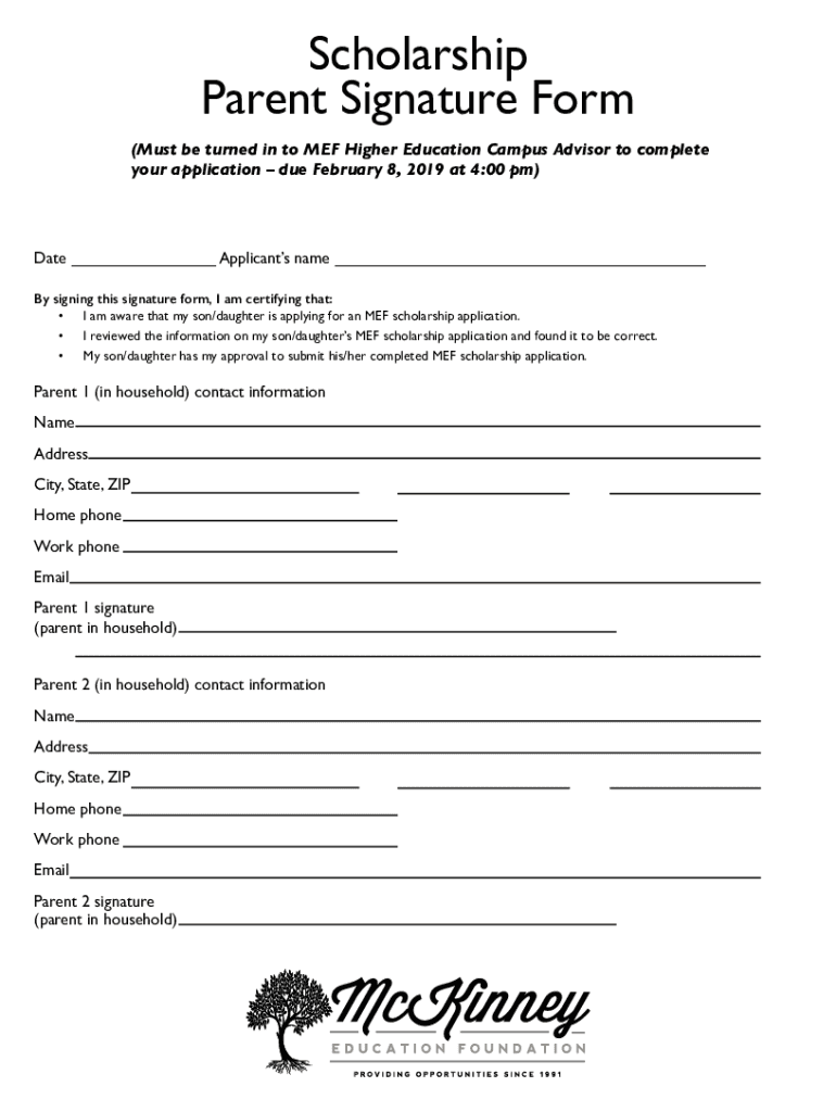 Scholarship Parent Signature Form (Must be turned in to MEF Higher Education Campus Advisor to complete your application due February 8, 2019, at 4:00 pm)Date Applicants name By signing this signature