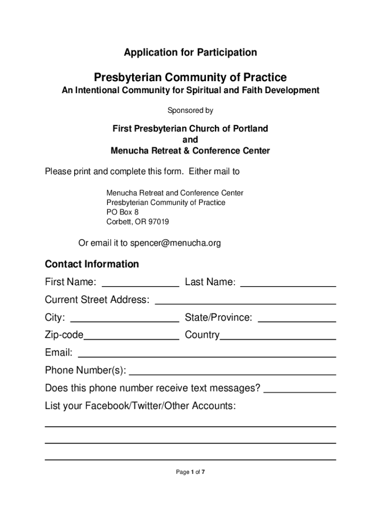 Application for Participation Presbyterian Community of Practice An Intentional Community for Spiritual and Faith Development Sponsored first Presbyterian Church of Portland and Mensch Retreat & Conference