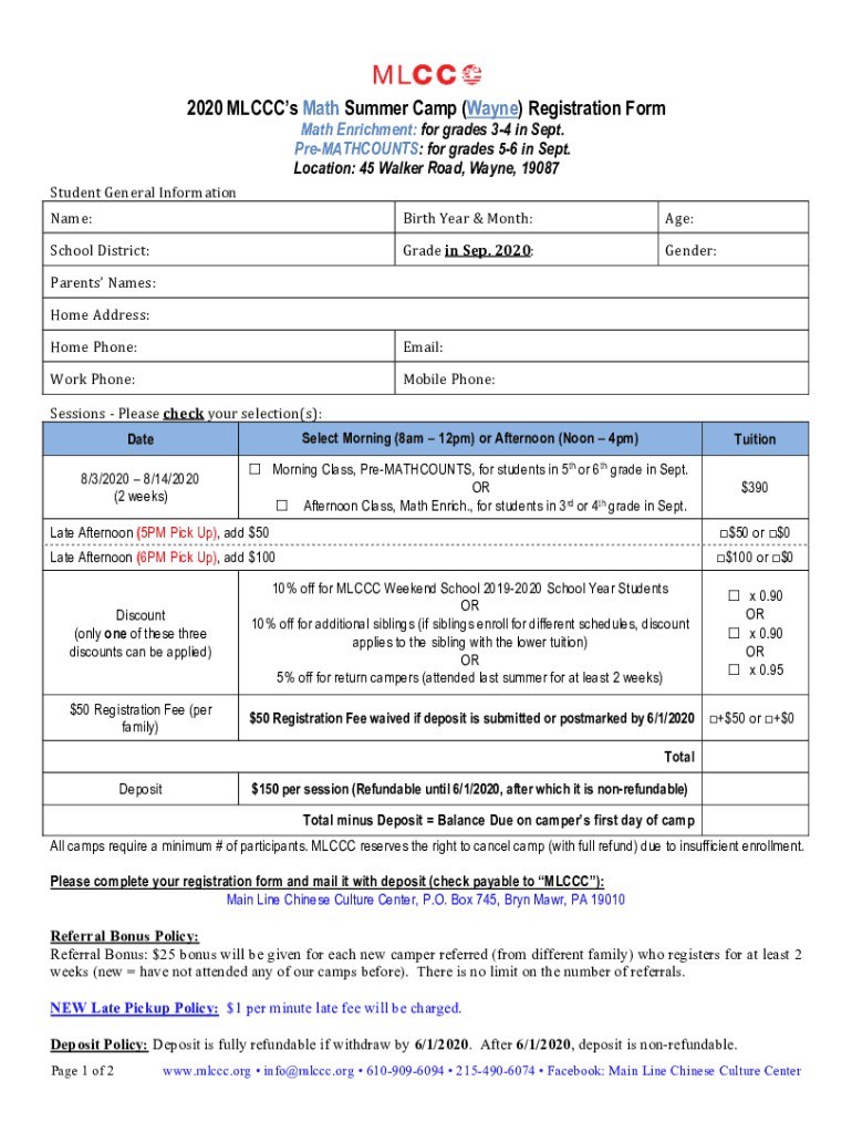 2020 Meccas Math Summer Camp (Wayne) Registration Form Math Enrichment: for grades 34 in Sept. PreMATHCOUNTS: for grades 56 in Sept. Location: 45 Walker Road, Wayne, 19087StudentGeneralInformation