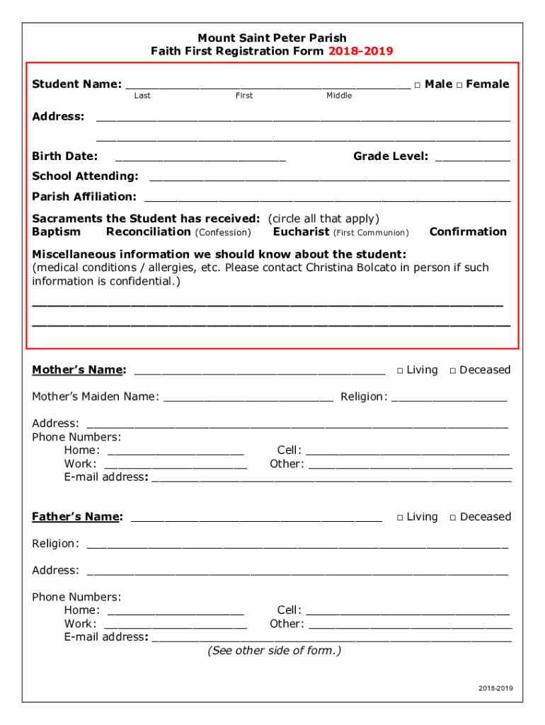 Mount Saint Peter Parish Faith First Registration Form 20182019 Student Name: Male Female Misaddress:FirstMiddle Birth Date: School Attending:Grade Level: Parish Affiliation: Sacraments the Student