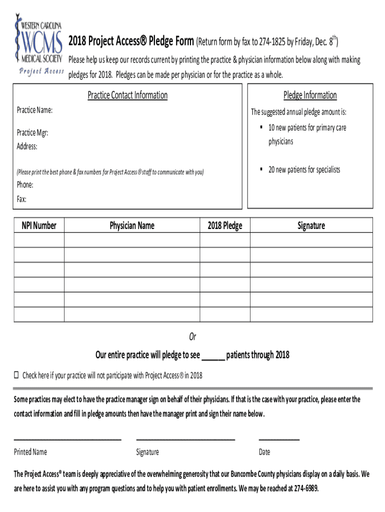 2018 Project Access Pledge Form (Return form by fax to 2741825 by Friday, Dec. 8th) Please help us keep our records current by printing the practice & physician information below along with making