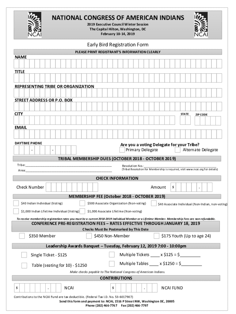 NATIONAL CONGRESS OF AMERICAN INDIANS 2019 Executive Council Winter Session The Capital Hilton, Washington, DC February 1014, 2019Early Bird Registration Form PLEASE PRINT REGISTRANTS INFORMATION