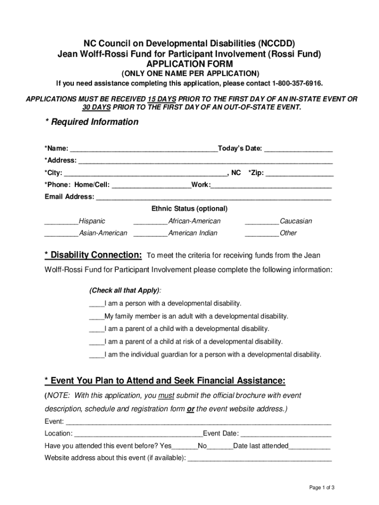 NC Council on Developmental Disabilities (NC CDD) Jean WolffRossi Fund for Participant Involvement (Rossi Fund) APPLICATION FORM (ONLY ONE NAME PER APPLICATION) If you need assistance completing this
