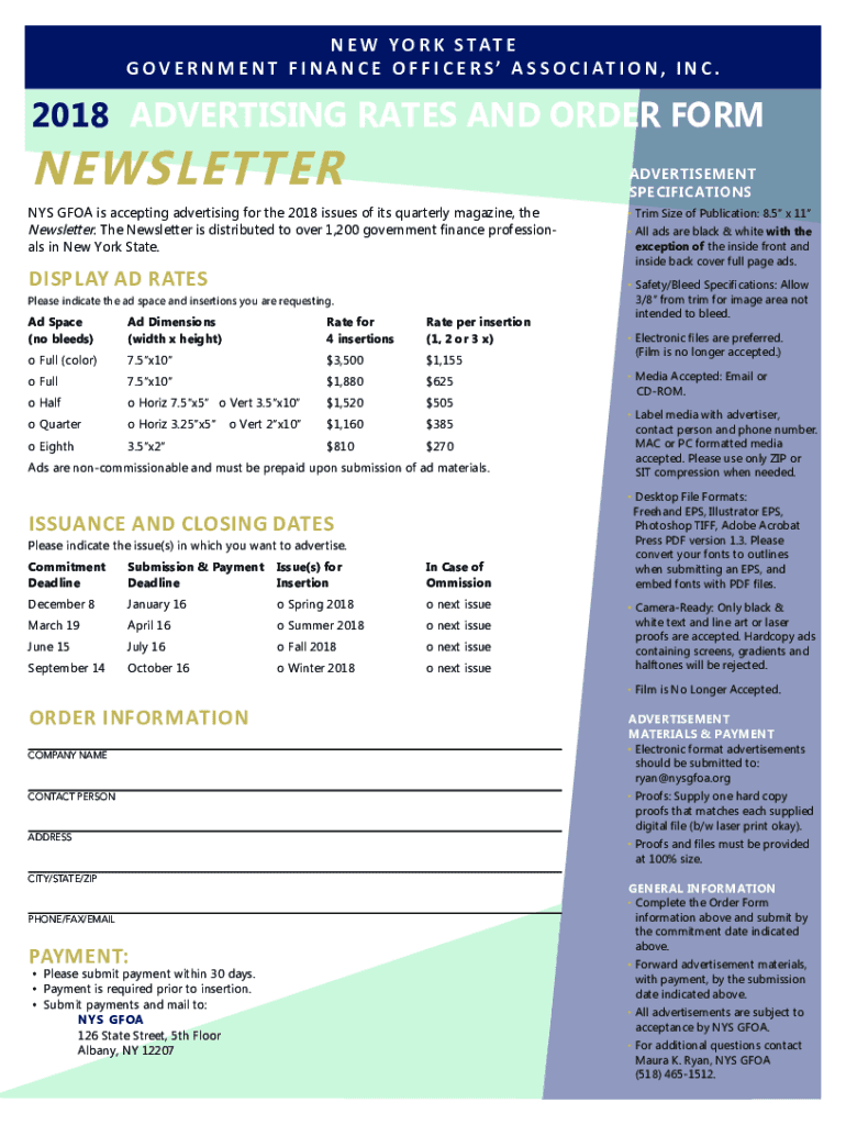 N E W Y O R K S TAT E G O V E R N M E N T F I N A N C E O F F I C E R S A S S O C I AT I O N, I N C .2018 ADVERTISING RATES AND ORDER FORMNEWSLETTERNYS GOA is accepting advertising for the 2018 issues