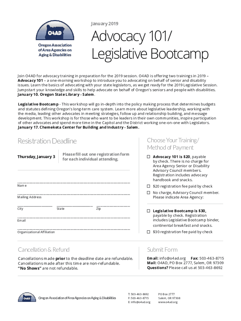 January 2019Oregon Association of Area Agencies on Aging & DisabilitiesAdvocacy 101/ Legislative BootcampJoin O4AD for advocacy training in preparation for the 2019 session. O4AD is offering two trainings