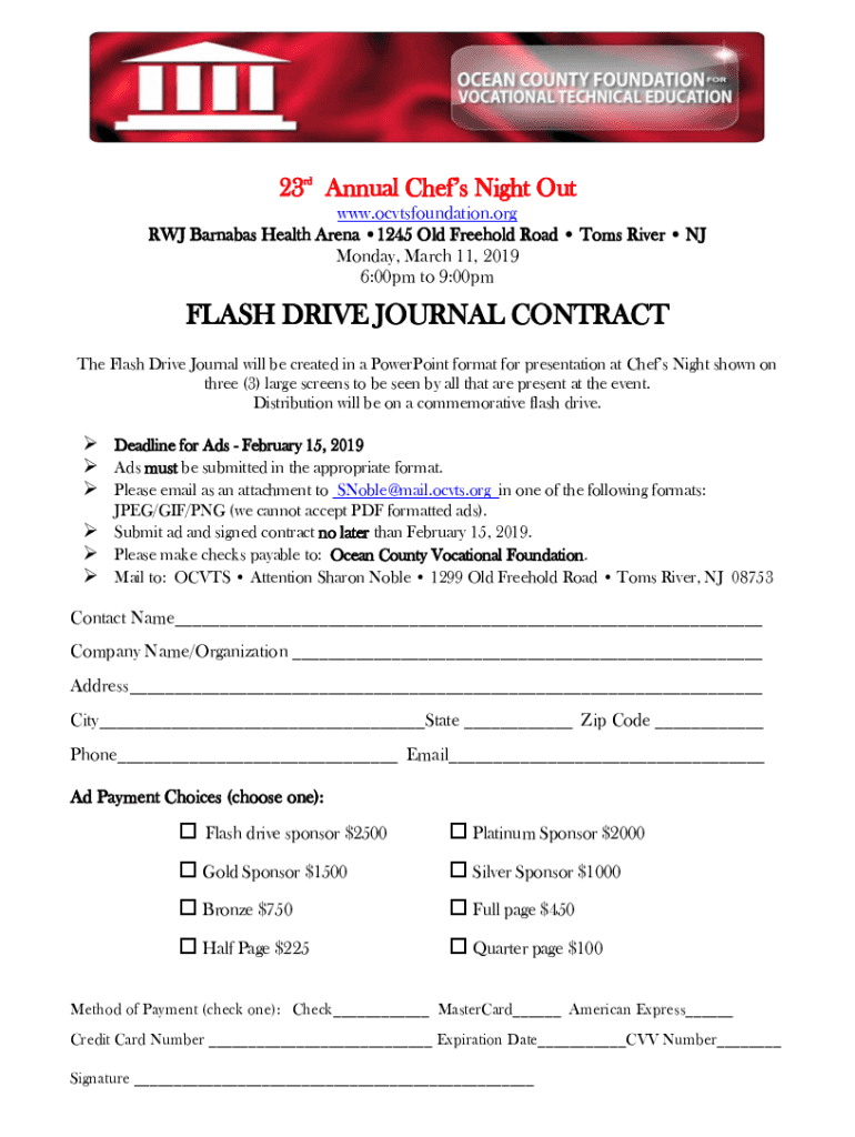 23rd Annual Chefs Night Out www.ocvtsfoundation.org RJ Barnabas Health Arena 1245 Old Freehold Road Toms River NJ Monday, March 11, 2019 6:00pm to 9:00pmFLASH DRIVE JOURNAL CONTRACT The Flash Drive