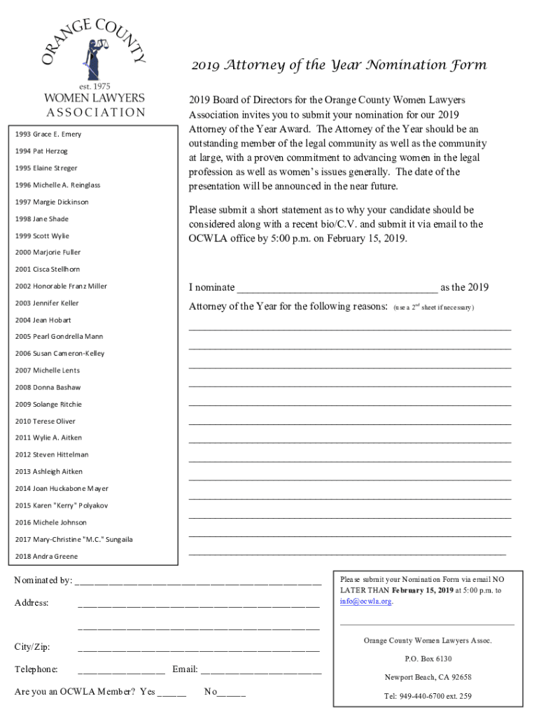 2019 Attorney of the Year Nomination Form1993 Grace E. Emery1994 Pat Herzog1995 Elaine Streger1996 Michelle A. Reinglass1997 Margie Dickinson1998 Jane Shade1999 Scott Wylie2019 Board of Directors
