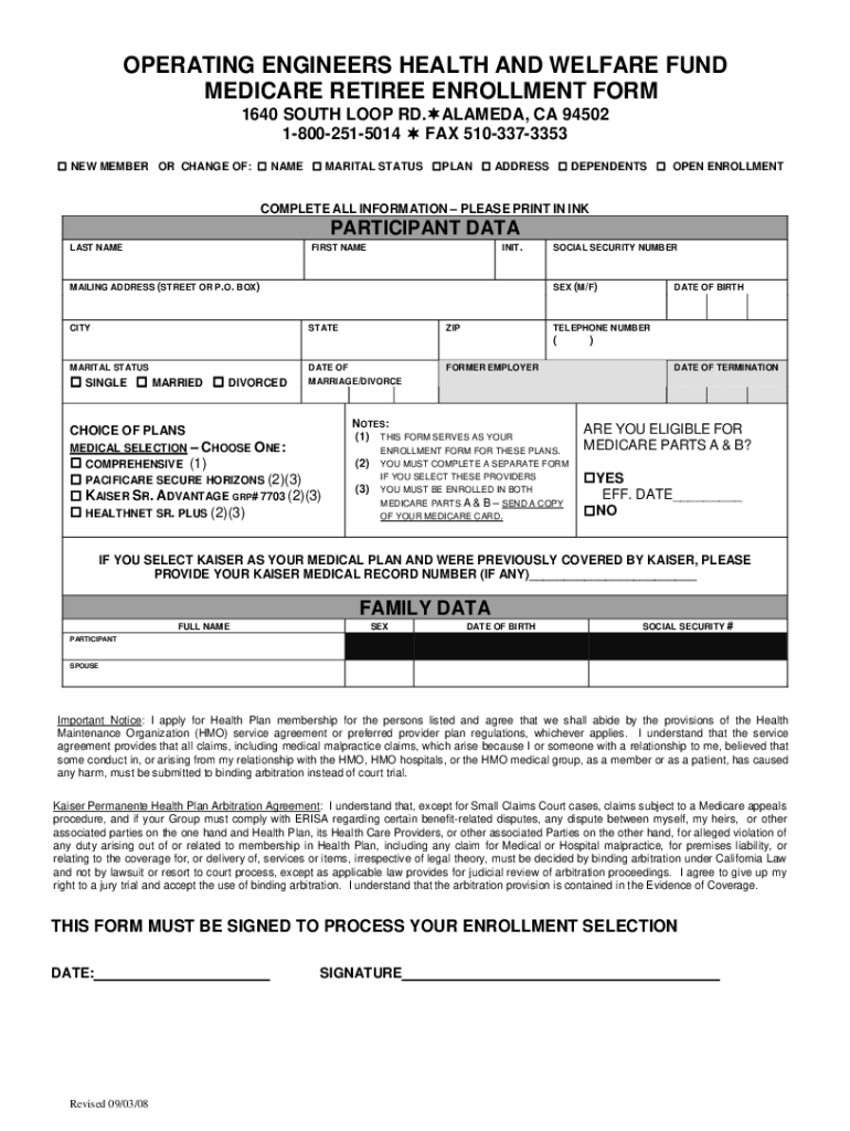 OPERATING ENGINEERS HEALTH AND WELFARE FUND MEDICARE RETIREE ENROLLMENT FORM 1640 SOUTH LOOP RD.ALAMEDA, CA 94502 18002515014 FAX 5103373353 NEW MEMBER OR CHANGE OF: NAME MARITAL STATUS PLAN ADDRESS