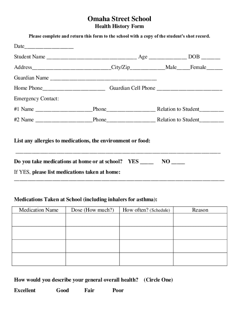 Omaha Street School Health History Form Please complete and return this form to the school with a copy of the students shot record. Date Student Name Age DOB Address City/Zip Male Female Guardian