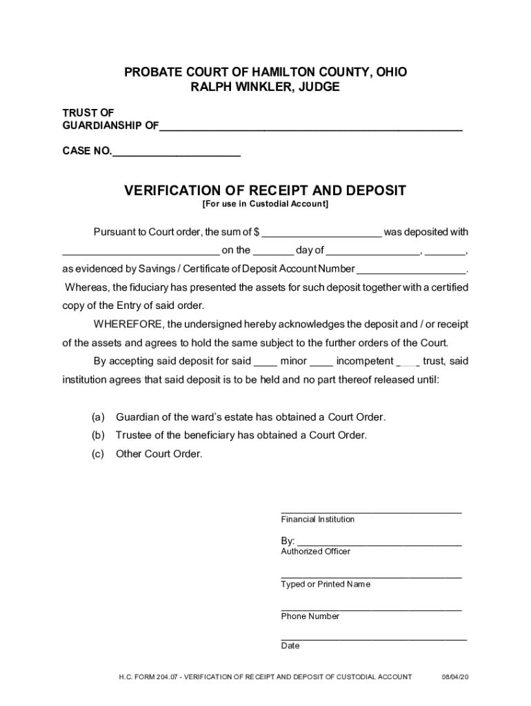 PROBATE COURT OF HAMILTON COUNTY, OHIO RALPH WINKLER, JUDGE TRUST OF GUARDIANSHIP OF CASE NO. VERIFICATION OF RECEIPT AND DEPOSIT For use in Custodial Account Pursuant to Court order, the sum of $