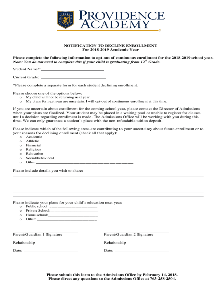 NOTIFICATION TO DECLINE ENROLLMENT For 20182019 Academic Year Please complete the following information to op tout of continuous enrollment for the 20182019 school year. Note: You do not need to complete