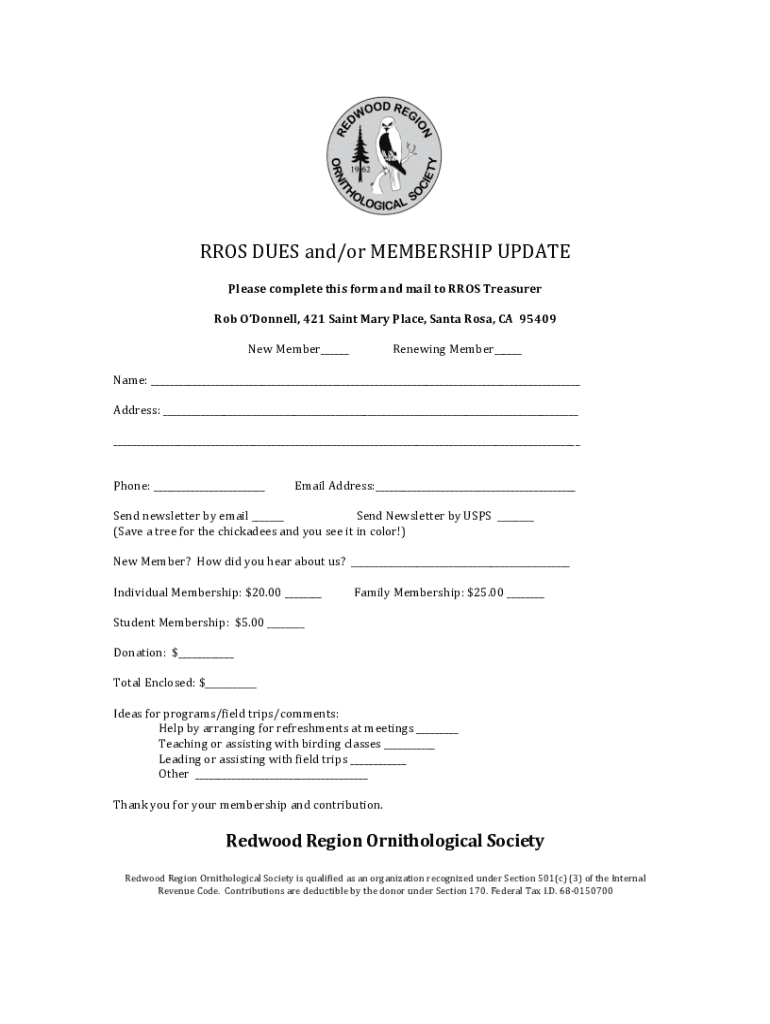 BROS DUES and/or MEMBERSHIP UPDATEPlease complete this form and mail to BROS Treasurer Rob O'Donnell, 421 Saint Mary Place, Santa Rosa, CA95409New Member Renewing Member Name: Address: Phone: Email