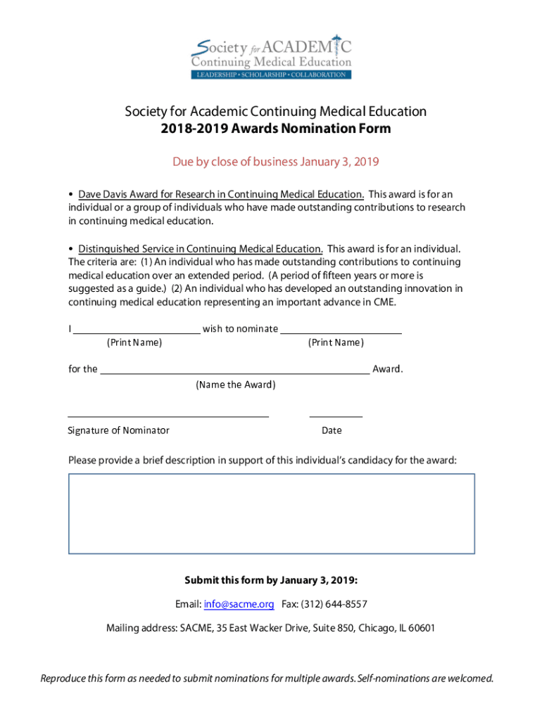 Society for Academic Continuing Medical Education 20182019 Awards Nomination Form Due by close of business January 3, 2019, Dave Davis Award for Research in Continuing Medical Education. This award
