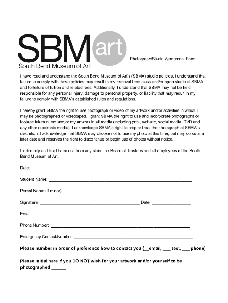 Photography/Studio Agreement Form have read and understand the South Bend Museum of Arts (BMA) studio policies. I understand that