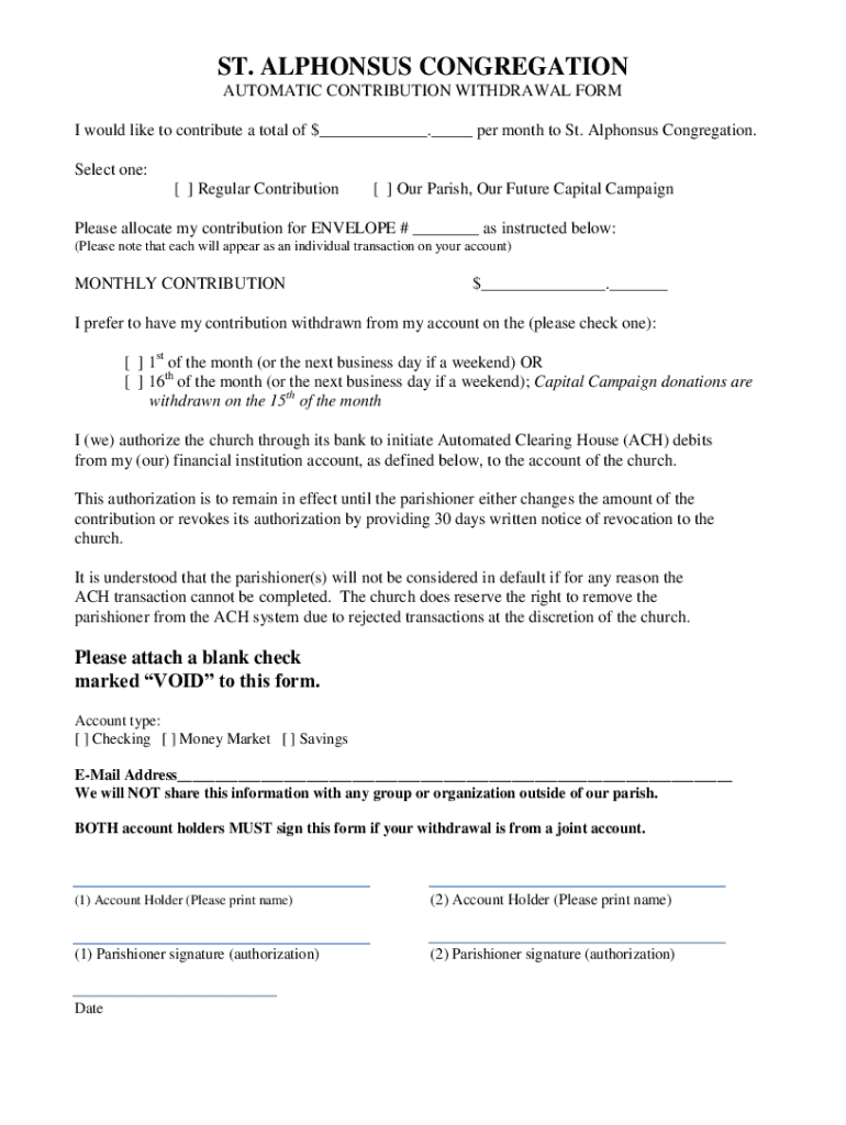 ST. ALPHONSE CONGREGATION AUTOMATIC CONTRIBUTION WITHDRAWAL FORM I would like to contribute a total of $. Per month to St. Alfonso Congregation. Select one: Regular Contribution Our Parish, Our Future