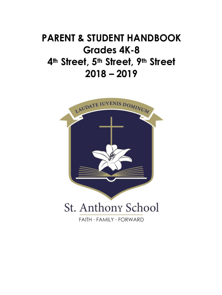 PARENT & STUDENT HANDBOOK Grades 4K8 4th Street, 5th Street, 9th Street 2018 2019Table of Contents Academic Policies/Progress Report26Academic Standards56Academic information K48th41Accreditation8Acceptable