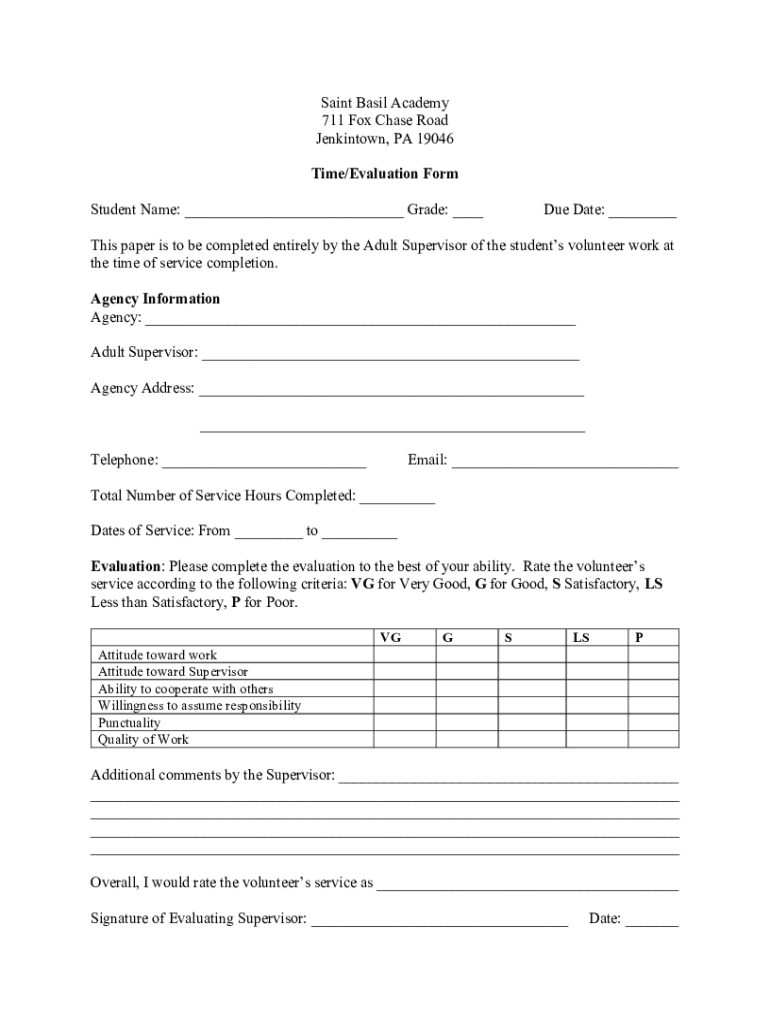 Saint Basil Academy 711 Fox Chase Road Jenkintown, PA 19046 Time/Evaluation Form Student Name: Grade: Due Date: This paper is to be completed entirely by the Adult Supervisor of the students volunteer