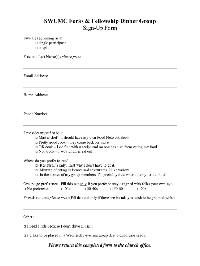 SWUM Forks & Fellowship Dinner Group Sign-up Form I/we are registering as a: single participant couple First and Last Name(s): please princelier Address:Home Address:Phone Number:I consider myself