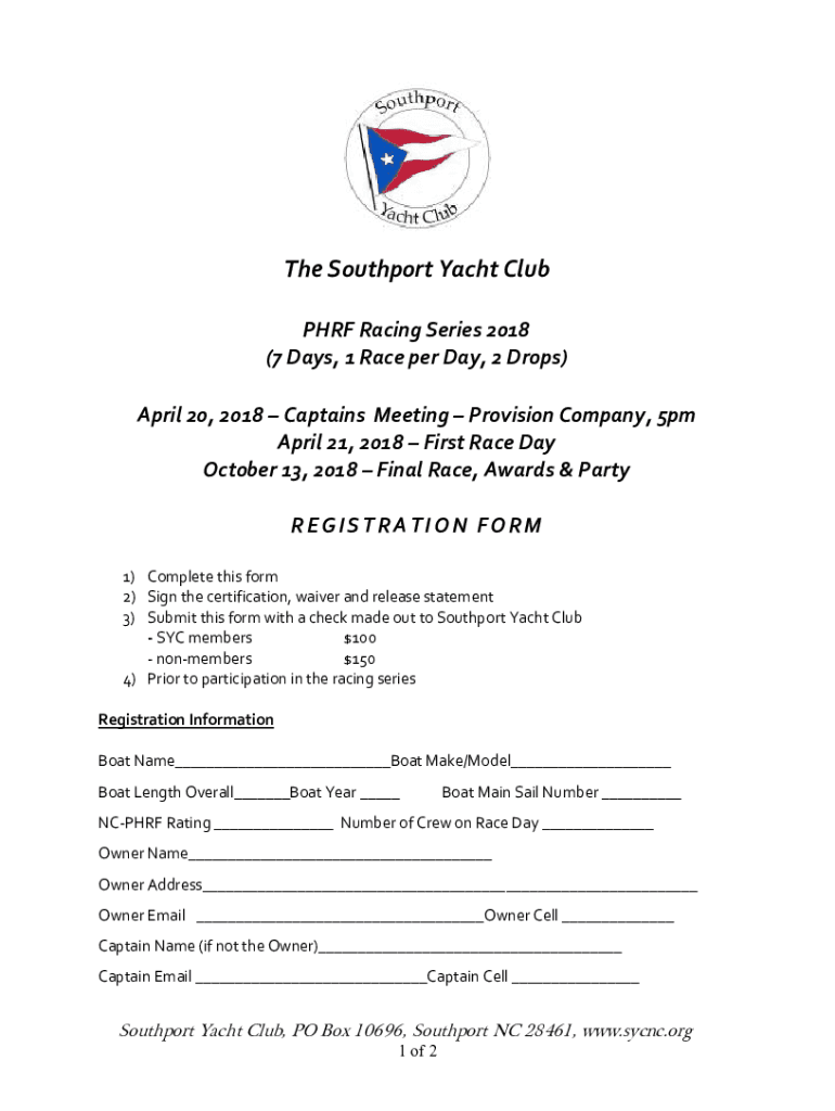 The Southport Yacht Club PHR Racing Series 2018 (7 Days, 1 Race per Day, 2 Drops) April 20, 2018, Captains Meeting Provision Company, 5pm April 21, 2018, First Race Day October 13, 2018, Final Race,