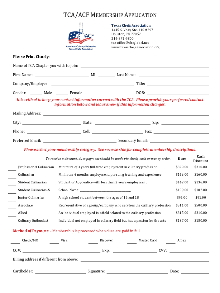 TCA/ACF MEMBERSHIP APPLICATION Texas Chefs Association1415 S. Loss, Ste. 110 #397Houston, TX 770572148719800tcaoffice@sbcglobal.netwww.texaschefsassociation.orgPlease Print Clearly:Name of TCA Chapter you wish to join:First Name:MI:Last Name:Company/Employer:Title:Gender:MaleFemaleDOB:It is critical to keep your contact information current with the TCA.
