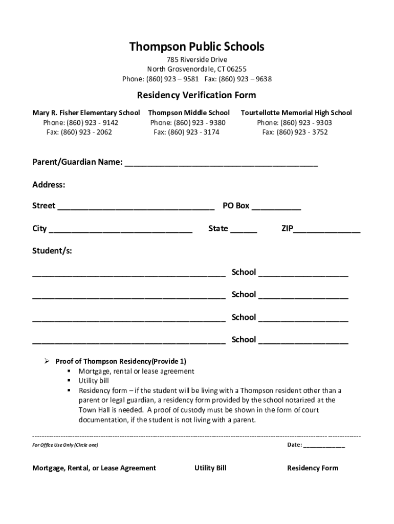 Thompson Public Schools 785 Riverside Drive North Grosvenordale, CT 06255 Phone: (860) 923 9581 Fax: (860) 923 9638Residency Verification Form Mary R. Fisher Elementary School Phone: (860) 923 9142