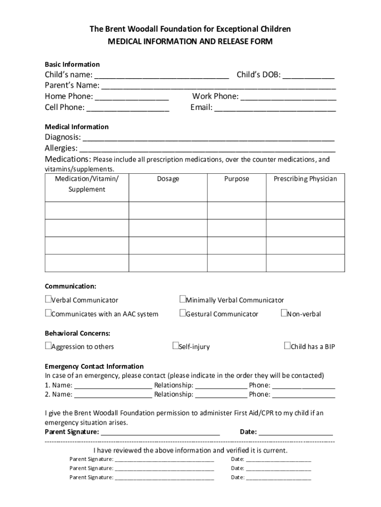 The Brent Woodall Foundation for Exceptional Children MEDICAL INFORMATION AND RELEASE FORM Basic InformationChilds name: Child's DOB: Parents Name: Home Phone: Work Phone: Cell Phone: Email: Medical