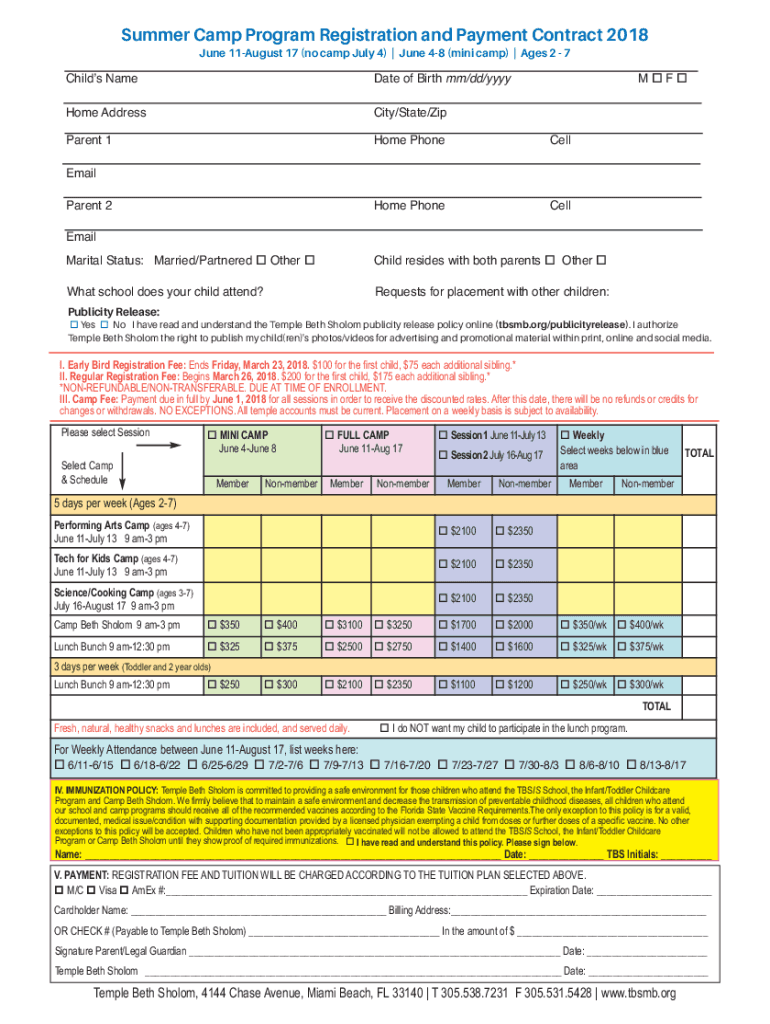 Summer Camp Program Registration and Payment Contract 2018 Child's Name June 11August 17 (no camp July 4) June 48 (mini camp) Ages 2 7Date of Birth mm/dd/yyyyHome Addressing/State/Apparent 1Home PhoneCellParent