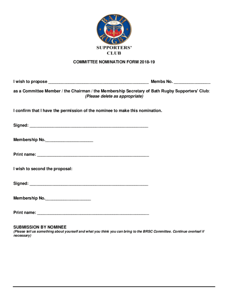 COMMITTEE NOMINATION FORM 201819I wish to propose Memos No. as a Committee Member / the Chairman / the Membership Secretary of Bath Rugby Supporters Club: (Please delete as appropriate) I confirm