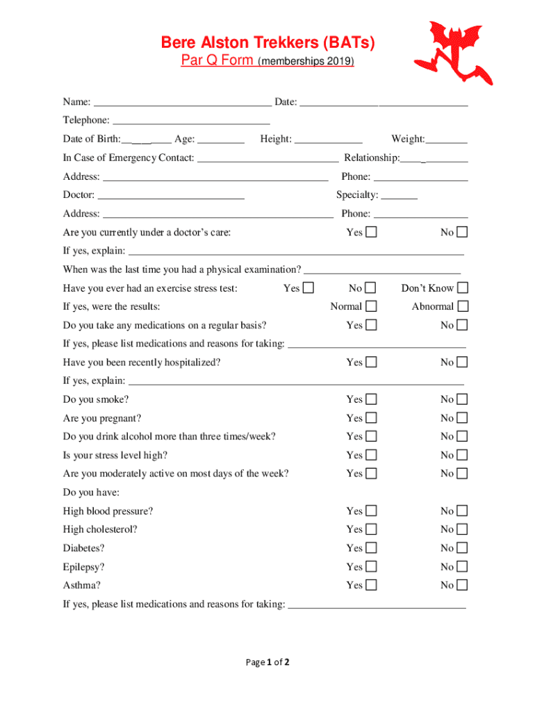 Bar Alston Trekkers (Bats) Par Q Form (memberships 2019) Name: Date: Telephone: Date of Birth: Age: Height: Weight: In Case of Emergency Contact: Relationship: Address: Doctor: Phone: Specialty: Address: