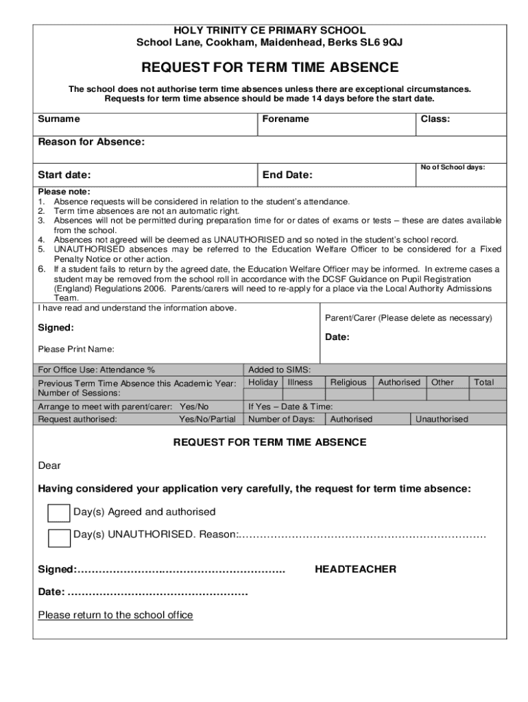 HOLY TRINITY CE PRIMARY SCHOOL Lane, Cook ham, Maidenhead, Berks SL6 9QJREQUEST FOR TERM TIME ABSENCE