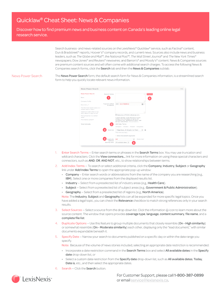 Quick law Cheat Sheet: News & Companies Discover how to find premium news and business content on Canada's leading online legal research service. Search business and news related sources on the LexisNexis