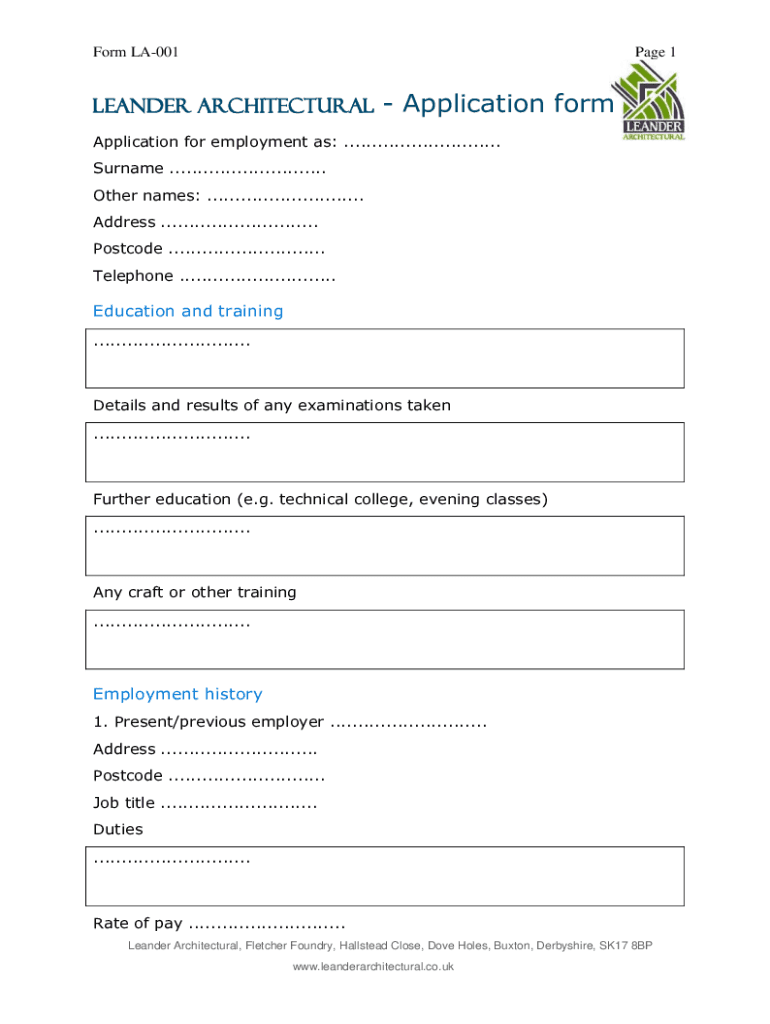 Form LA001Page 1Leander Architectural Application formalization for employment as: ............................ Surname ............................ Other names: ............................ Address