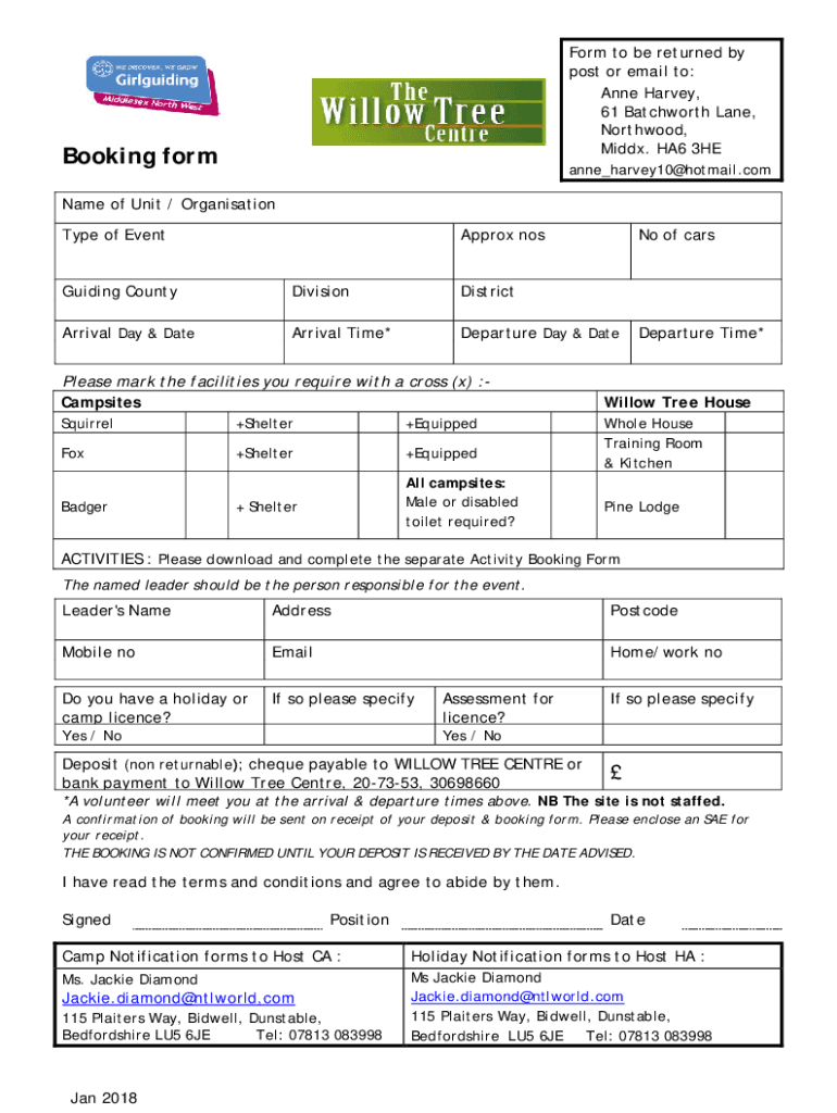 Get the free Booking Form Middx. HA6 3HE - Willow Tree Centre
