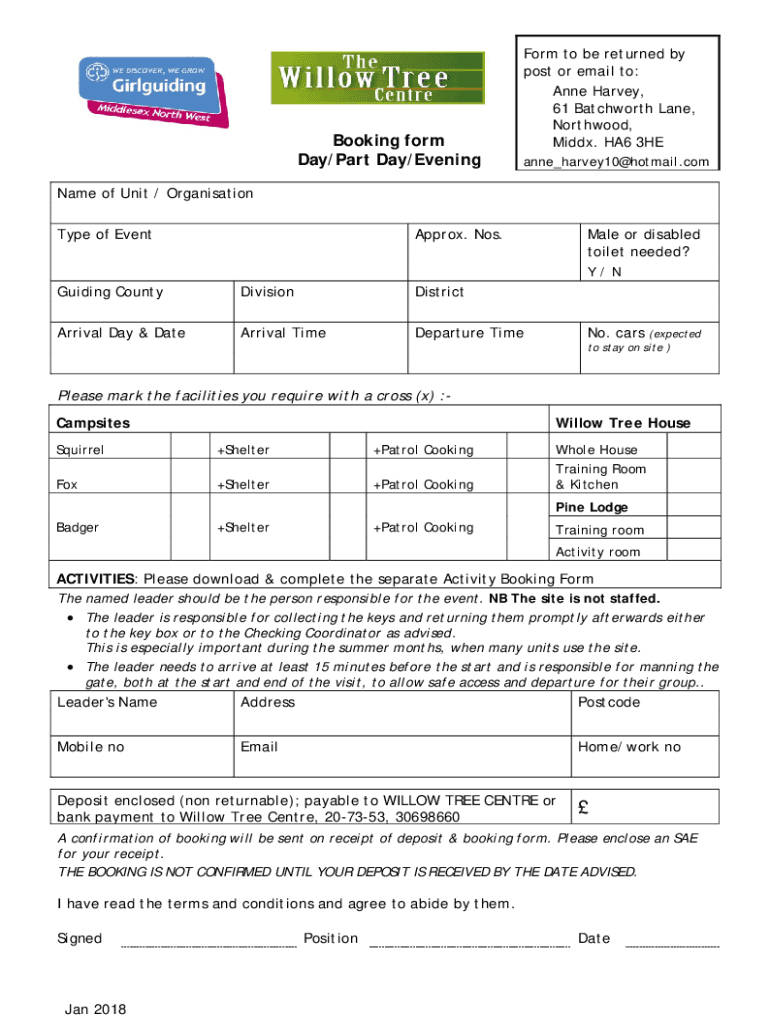 Get the free Booking Form Day/Part Day/ Evening - Willow Tree Centre