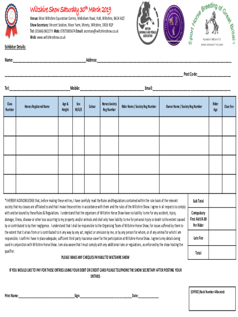 Wiltshire Show Saturday 30th March 2019 Venue: West Wiltshire Equestrian Center, Melissa Road, Holt, Wiltshire, BA14 6QT Show Secretary: Vincent Season, Moor Farm, Ninety, Wiltshire, SN16 9QP Tel: