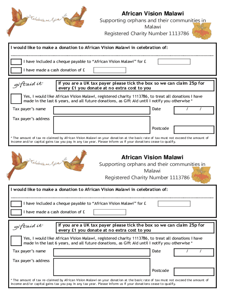 African Vision Malawi Supporting orphans and their communities in Malawi Registered Charity Number 1113786 I would like to make a donation to African Vision Malawi in celebration of: I have included
