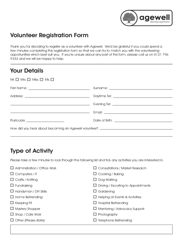 Thank you for deciding to register as a volunteer with Age well. We'd be grateful if you could spend a