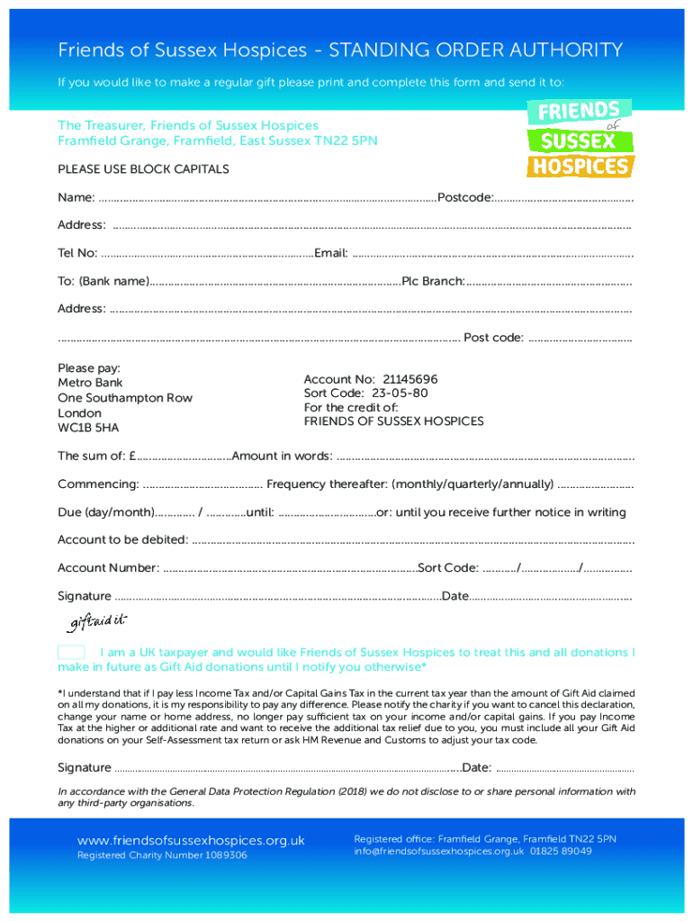 Friends of Sussex Hospices STANDING ORDER AUTHORITY If you would like to make a regular gift please print and complete this form and send it to:The Treasurer, Friends of Sussex Hospices Rayfield Grange,