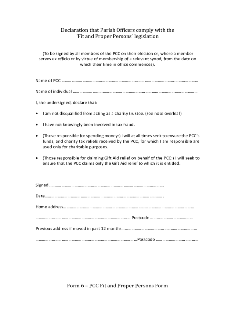 Declaration that Parish Officers comply with theft and Proper Persons legislation(To be signed by all members of the PCC on their election or, where a member
