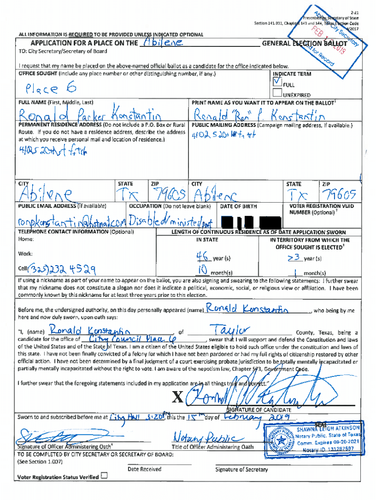 Section 141.031, Chapt143 and 144,/Arnall INFORMATION IS REQUIRED TO BE PROVIDED UNLESS INDICATED OPTIONALAPPLICATION FOR A PLACE ON THE221