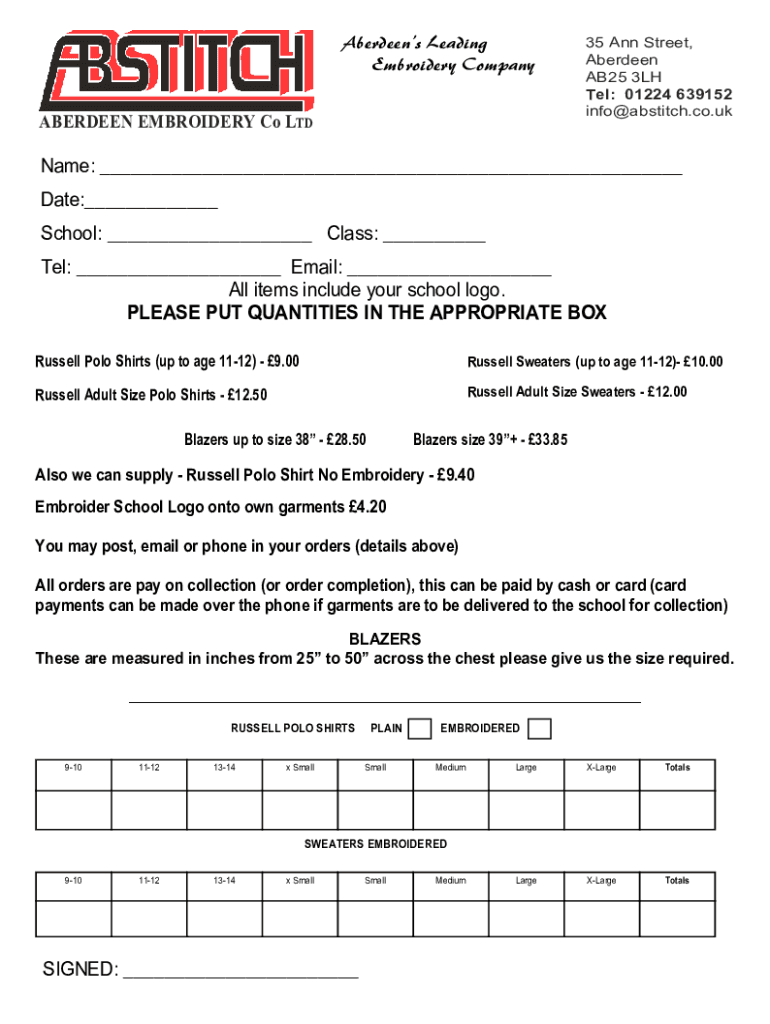 Aberdeen's Leading Embroidery CompanyABERDEEN EMBROIDERY Co LTD35 Ann Street, Aberdeen AB25 3LH Tel: 01224 639152 info ab stitch.co.name: Date: School: Class: Tel: Email: All items include your school