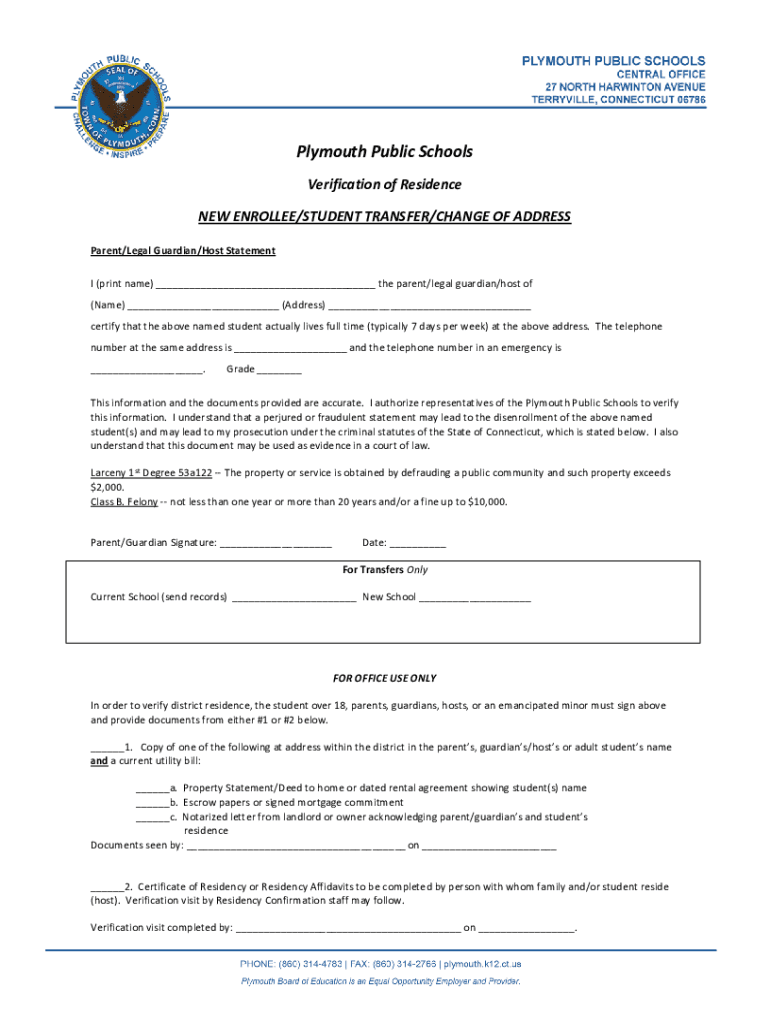 Plymouth Public Schools Verification of Residence NEW ENROLLED/STUDENT TRANSFER/CHANGE OF ADDRESS Parent/Legal Guardian/Host Statement I (print name) the parent/legal guardian/host of (Name) (Address)
