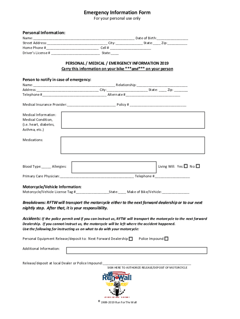 Get the free Emergency Information Form - Run For The Wall