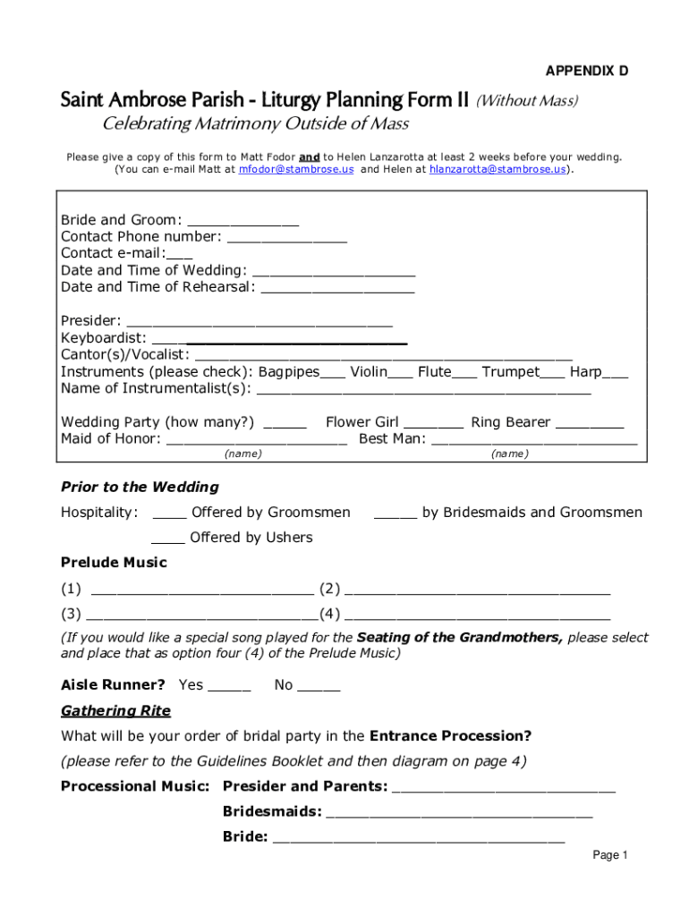 APPENDIX Saint Ambrose Parish Liturgy Planning Form II (Without Mass) Celebrating Matrimony Outside of Mass Please give a copy of this form to Matt Odor and to Helen Lanzarote at least 2 weeks before